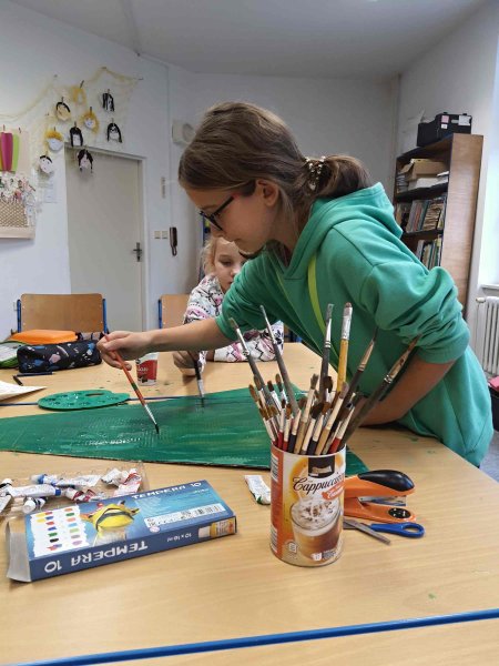 Při těšení se na příchod nejen sv. Mikuláše, ale i andělů a samozřejmě čertů, jsme vyrobili punčošky na dárky. Okna naší družiny jsme pomalovali zimními motivy s použitím bílé křídy. Na zdi jsme pověsili visací závěsné ozdoby vyrobené z přírodních materiálů jako je sušená kůra ovoce, šišky nebo větvičky. Povedl se nám i vánoční věnec z látkových odstřižků. Také jsme si postavili papírový Betlém s různými postavičkami. Nezapomněli jsme ani namalovat vodovými barvami vánoční stromeček a vytvořili jsme pomocí balónků, lepidla a vlny vánoční ozdobné koule.